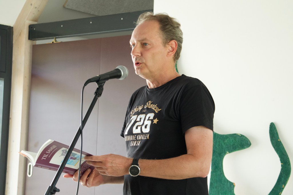 Til arrangement – der bla. foregik i styrtregn – kom jeg, sammen med de to andre redaktører af bogen Til Samsø, Carsten René Nielsen og Janne Hejgaard, og læste op af vores bidrag til antologien mod en Kattegatbro over Samsø – samt andre tekster.