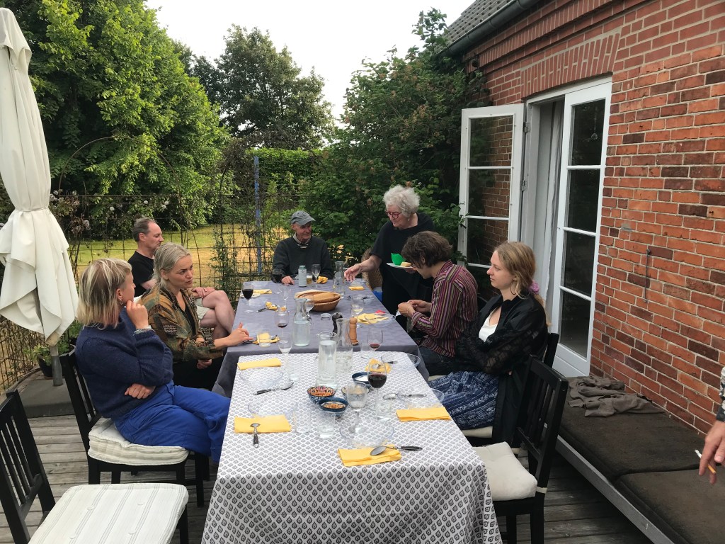 Dagen sluttede med middag hos Janne Hejgaard i hyggeligt lag med de fleste af de forfattere, der kom og læste op, samt Rina Lieberg der har lavet forsideillustrationen til bogen.